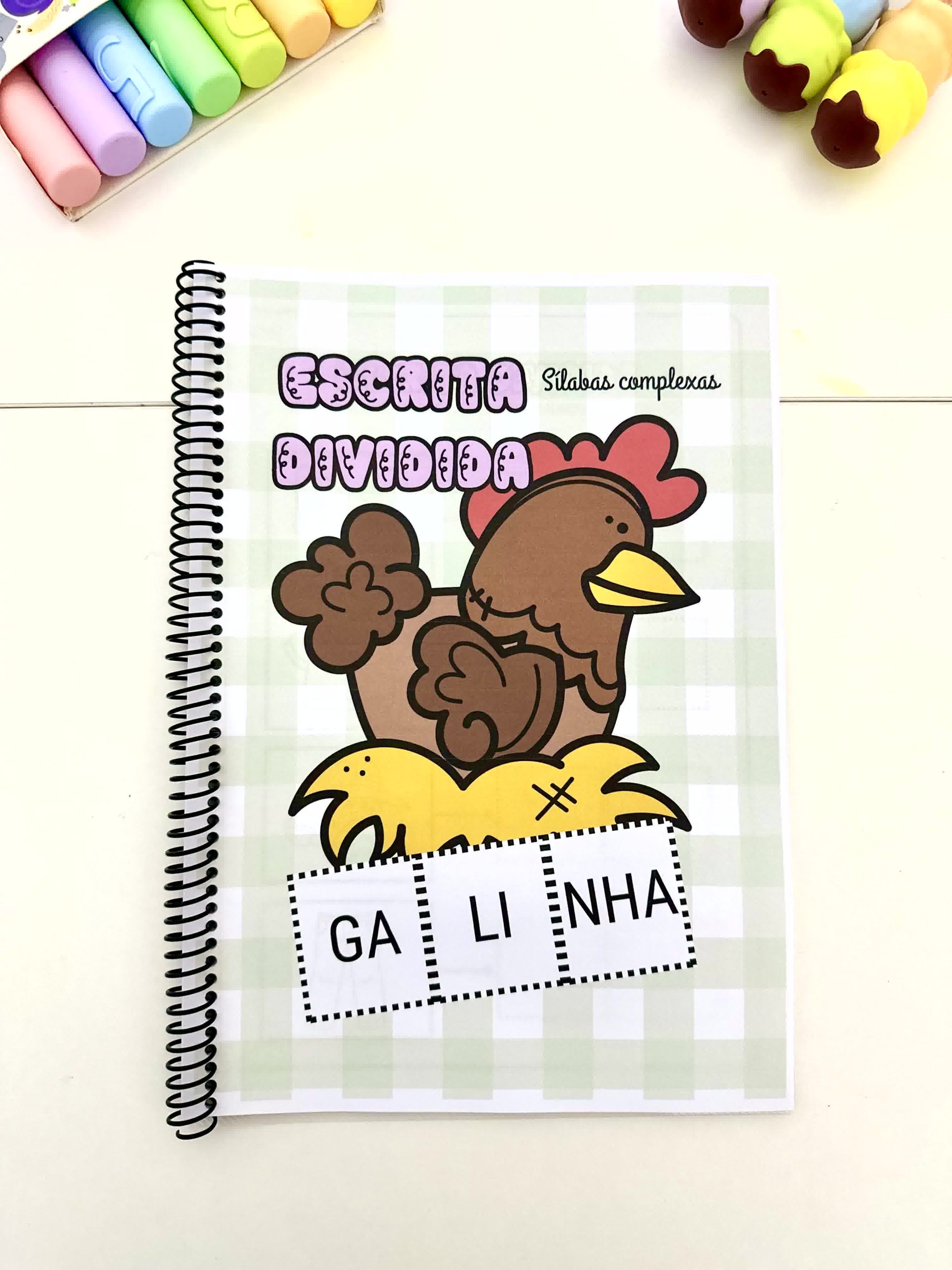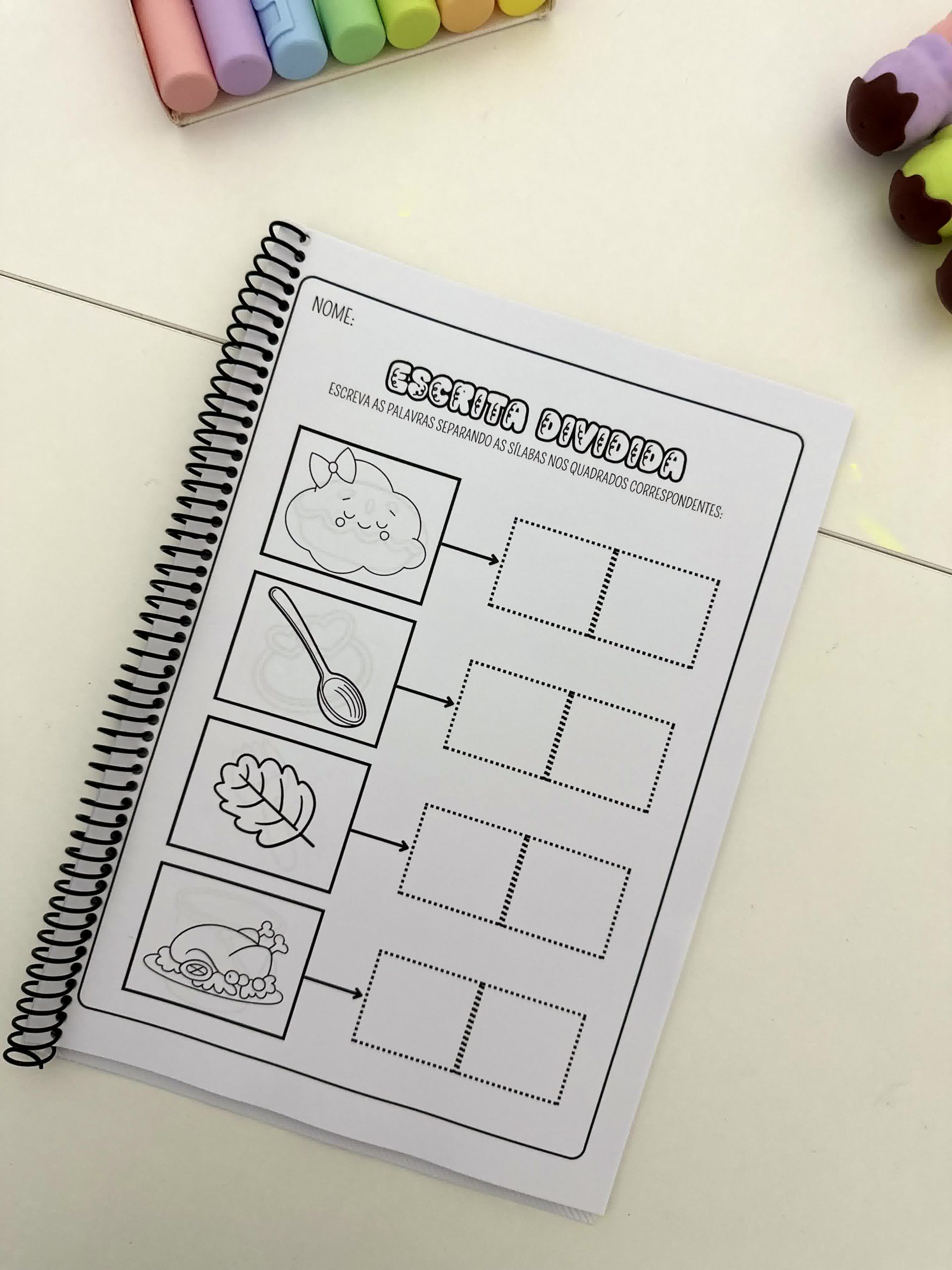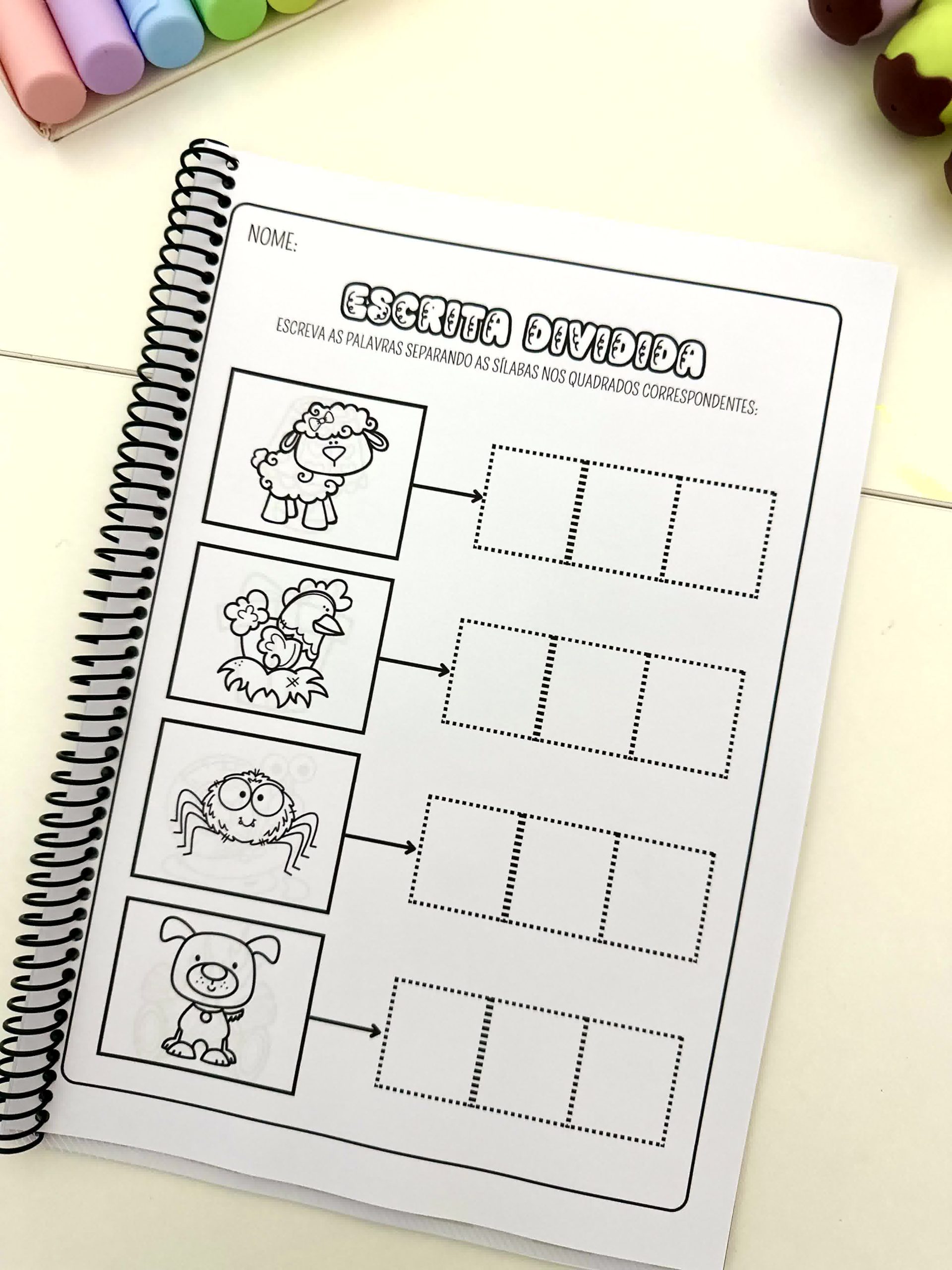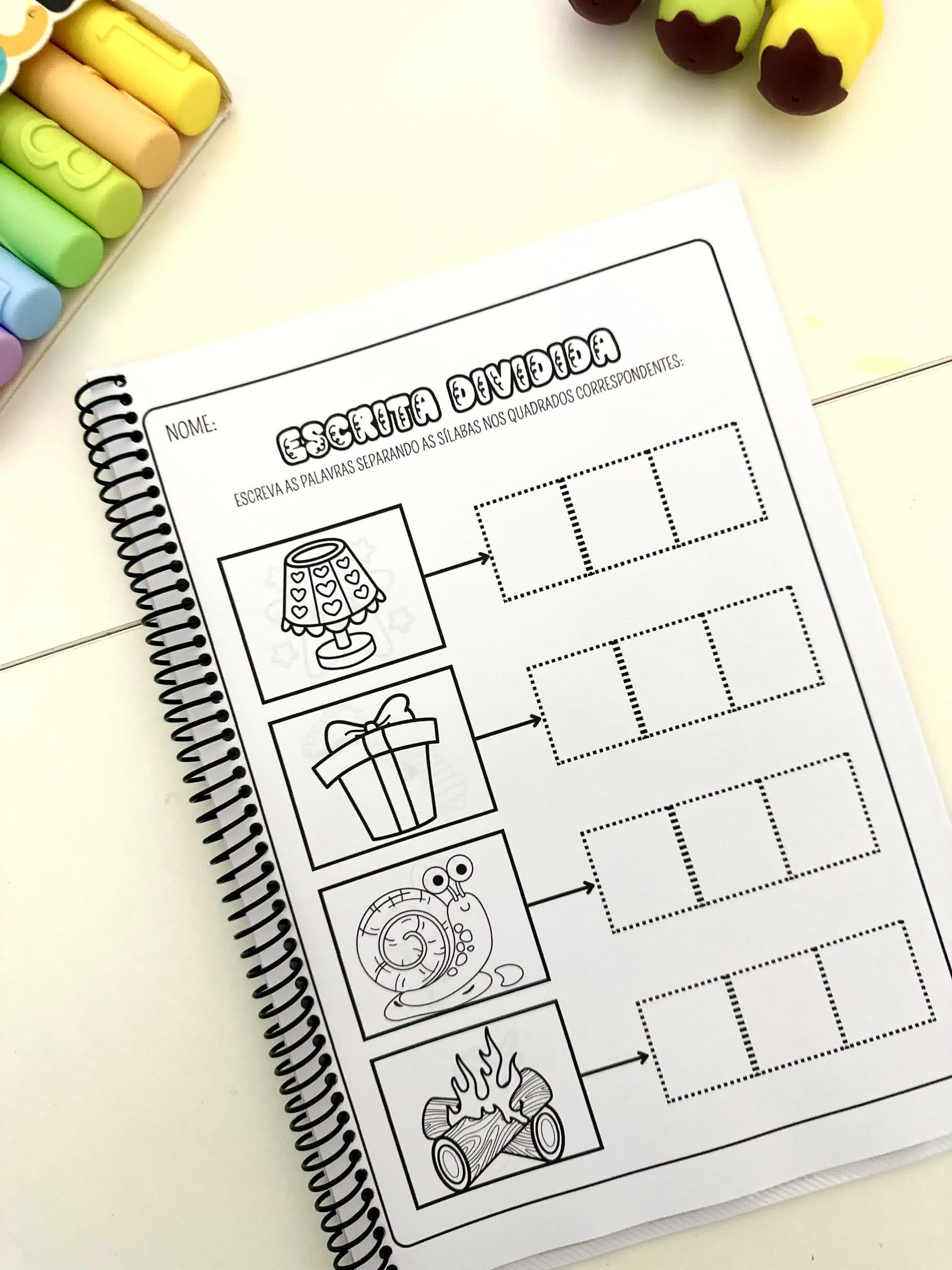 Apostila Escrita Dividida – Sílabas Complexas com 17 páginas de atividades para colorir para trabalhar escrita de palavras com crianças em fase de Alfabetização.