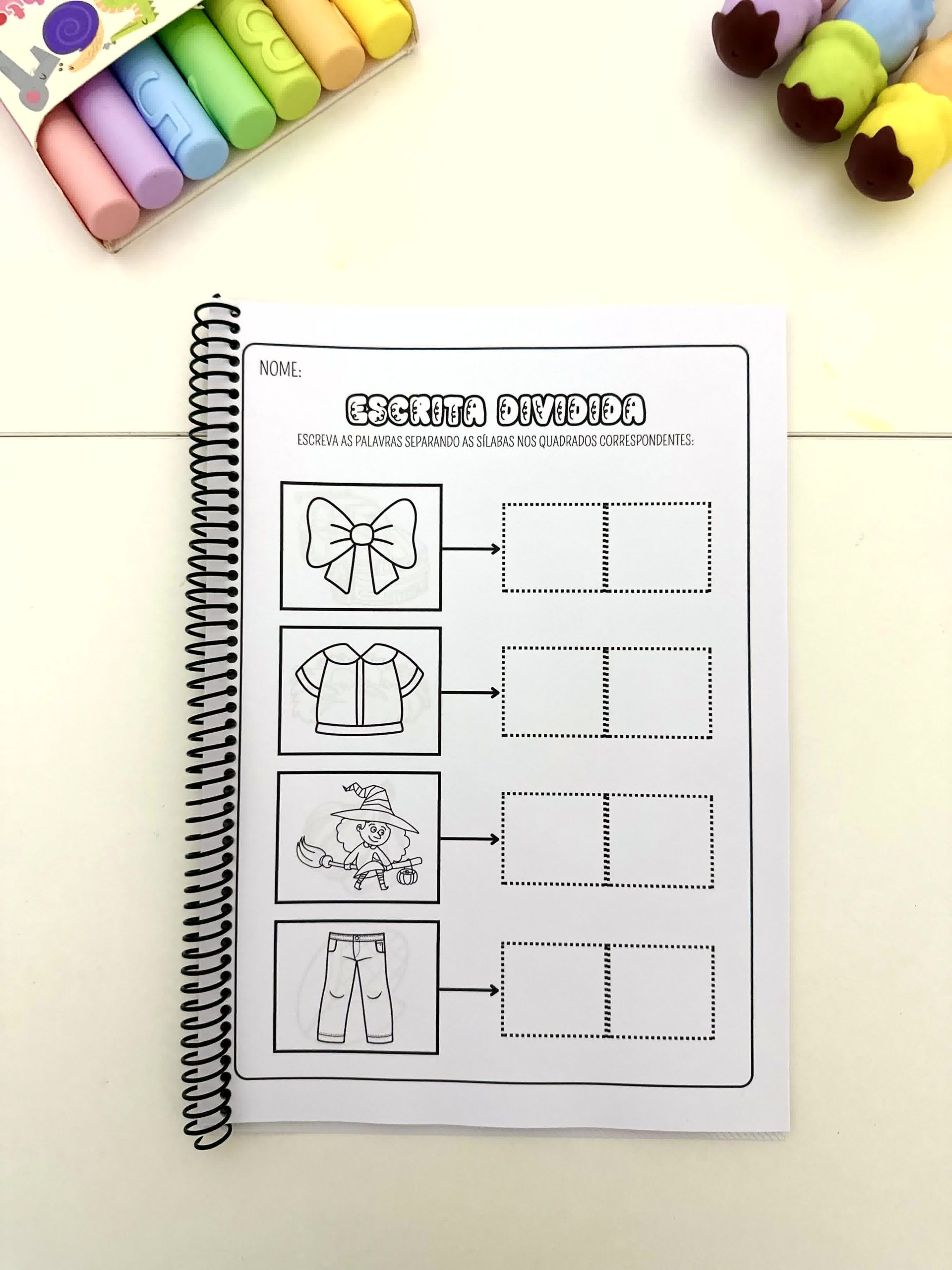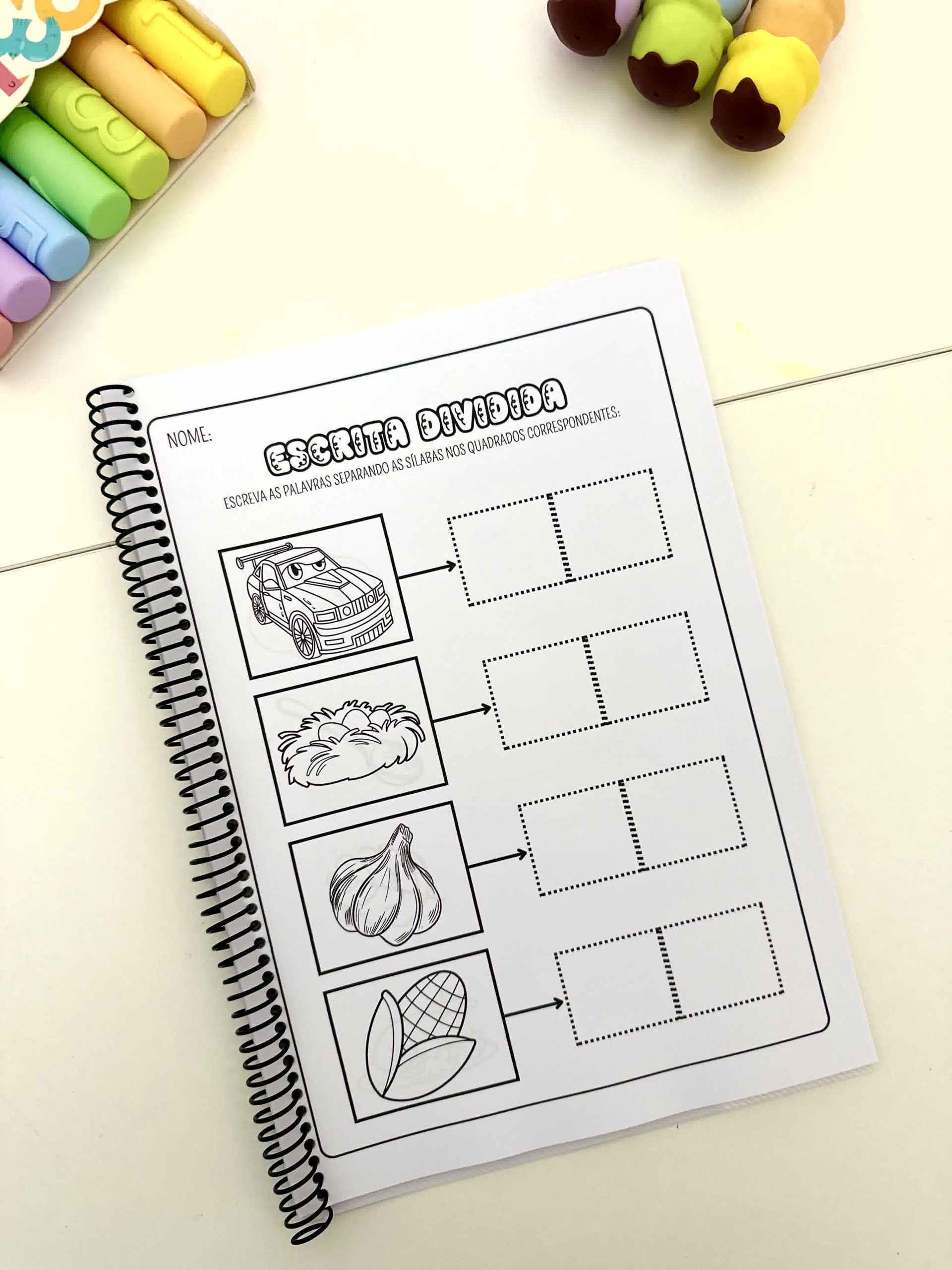 A criança deverá escrever o nome da figura organizando cada sílaba no espaço correspondente.