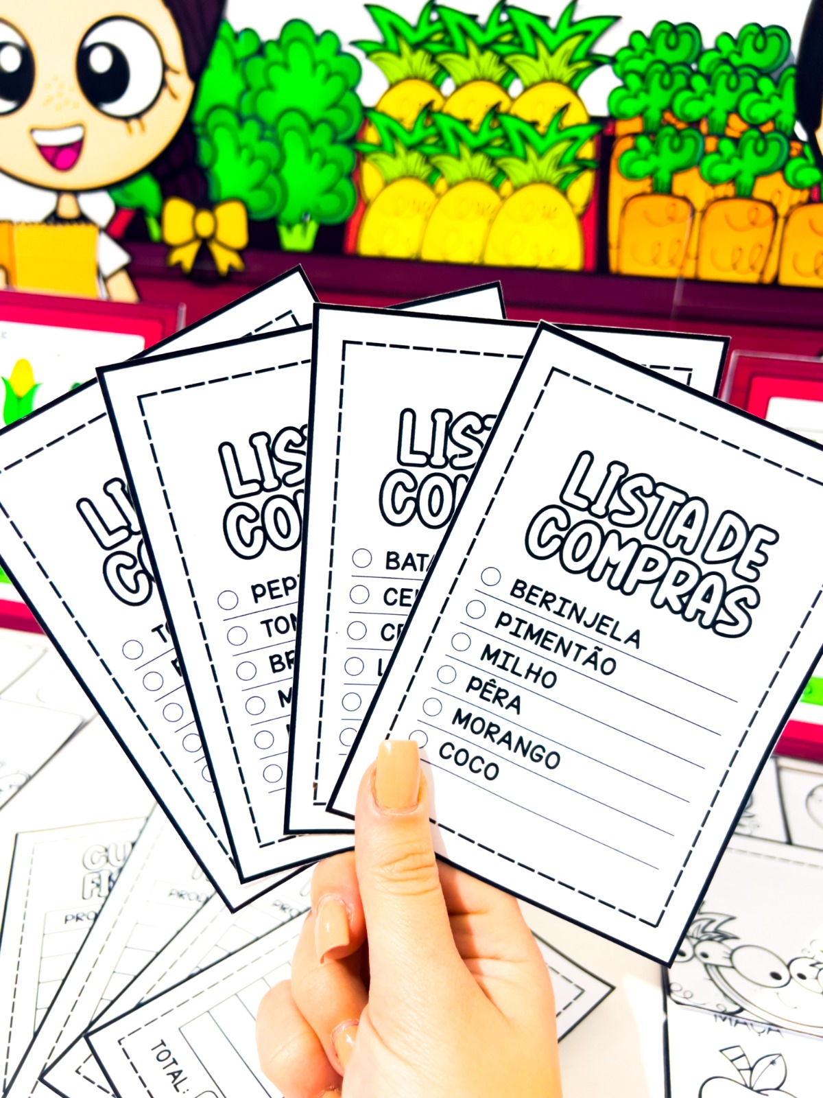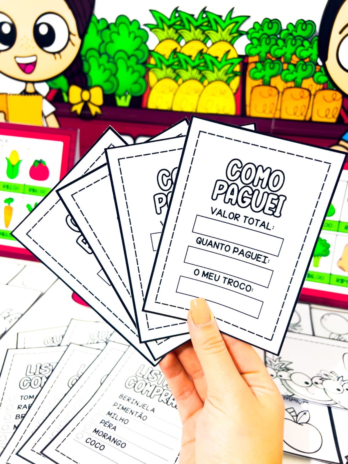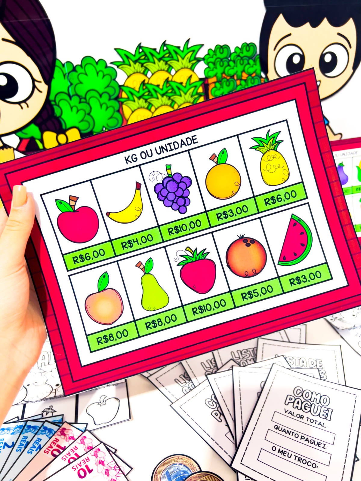 O material pedagógico Comprando na Feira foi criado para proporcionar às crianças uma experiência lúdica e educativa sobre compras, valores e o cotidiano da feira.