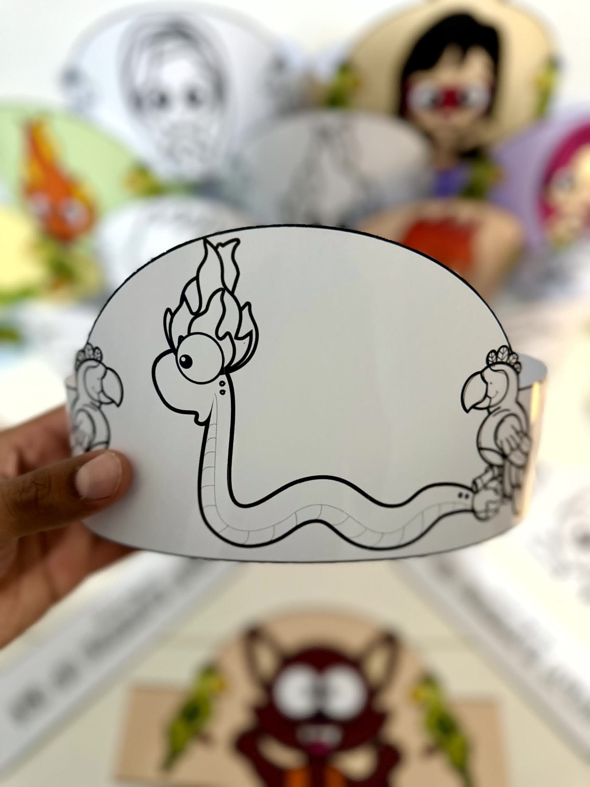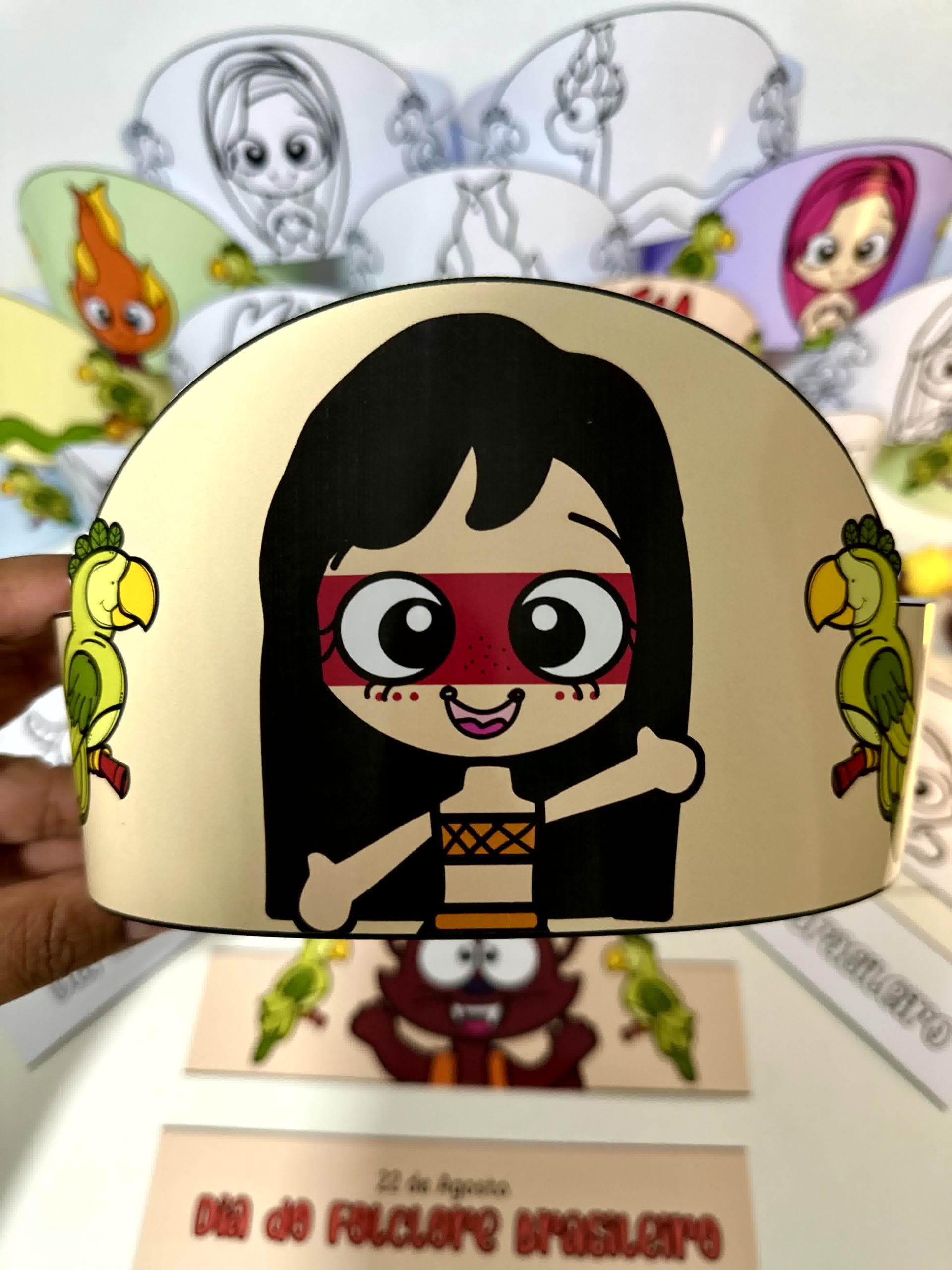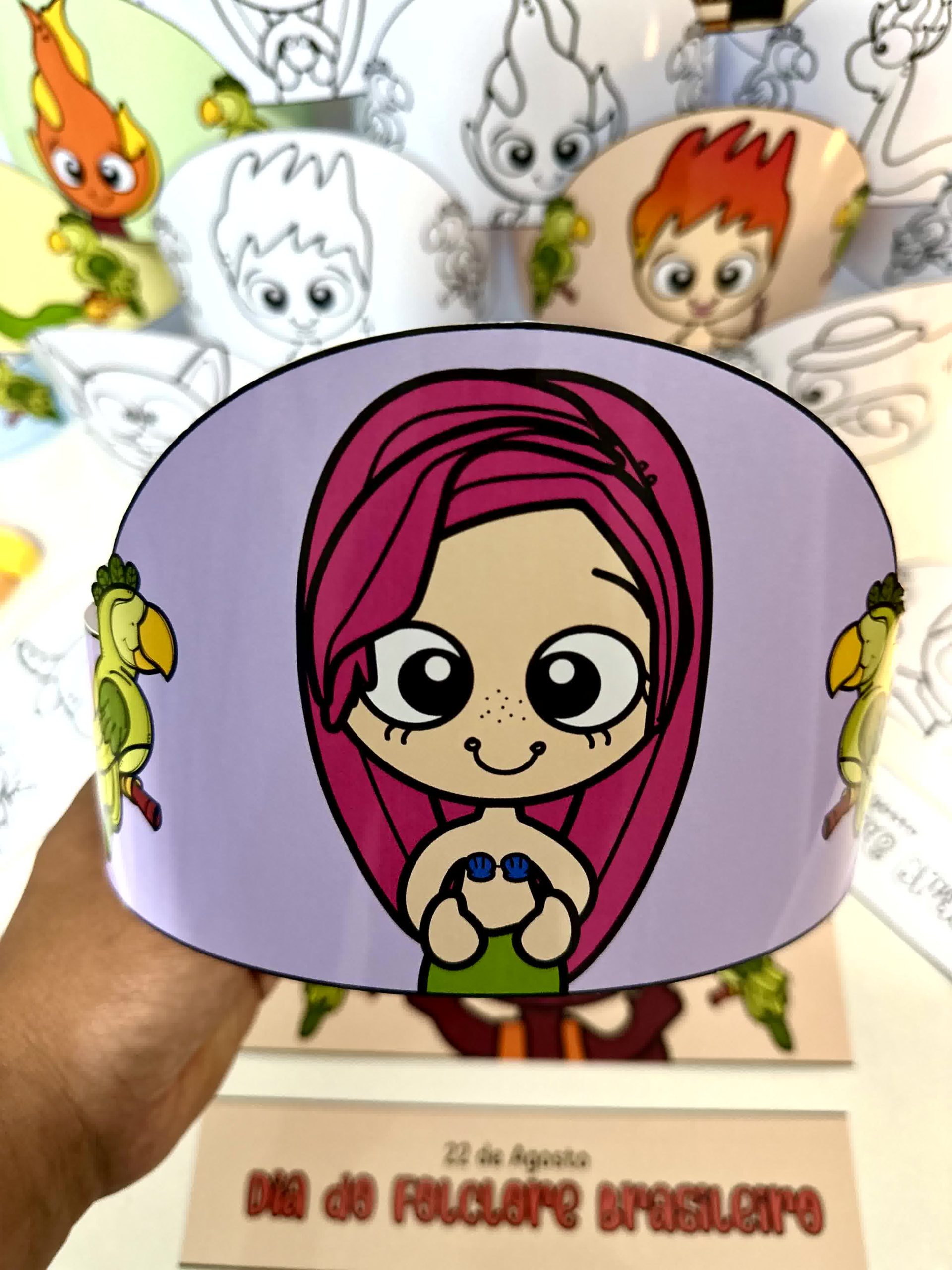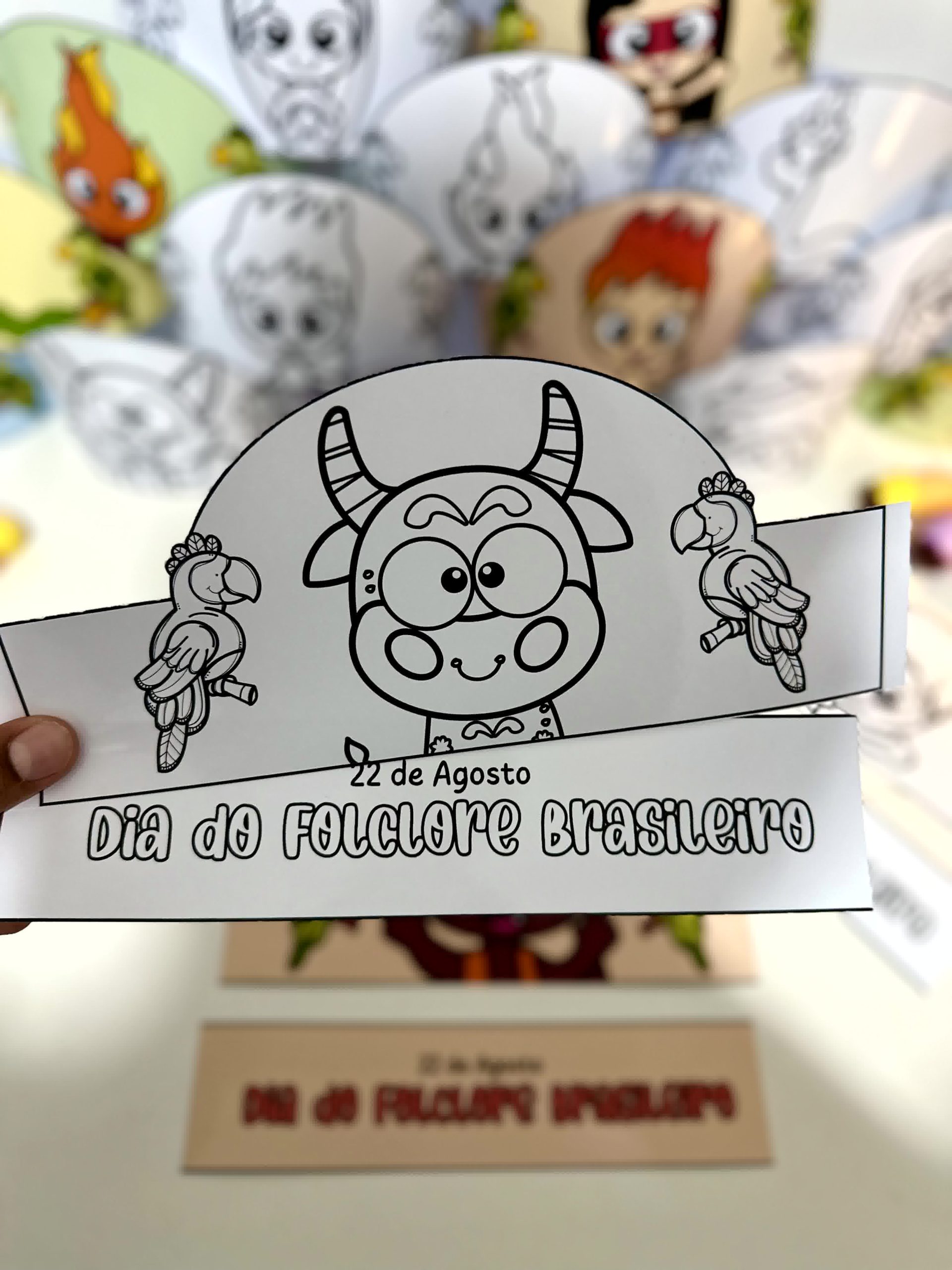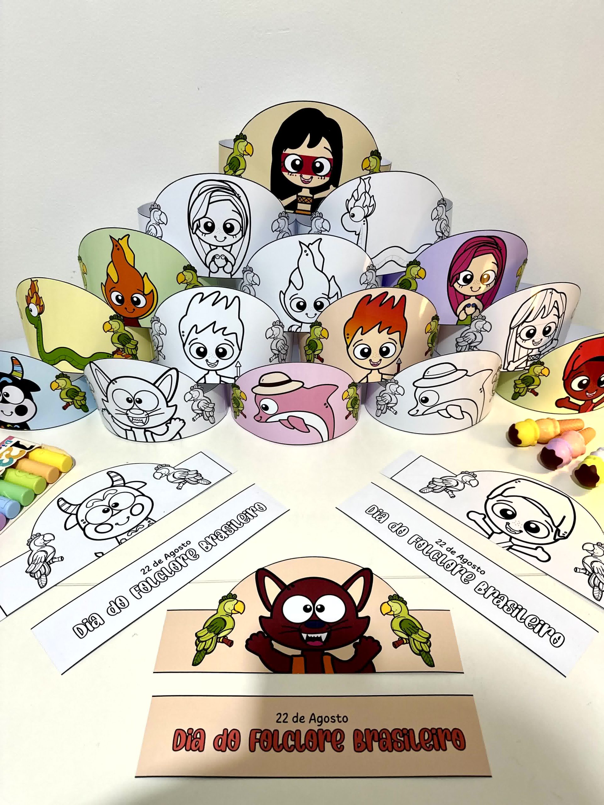 Vai com 9 coroas coloridas e 9 coroas para colorir, e inclui os personagens das principais lendas do Folclore Brasileiro.