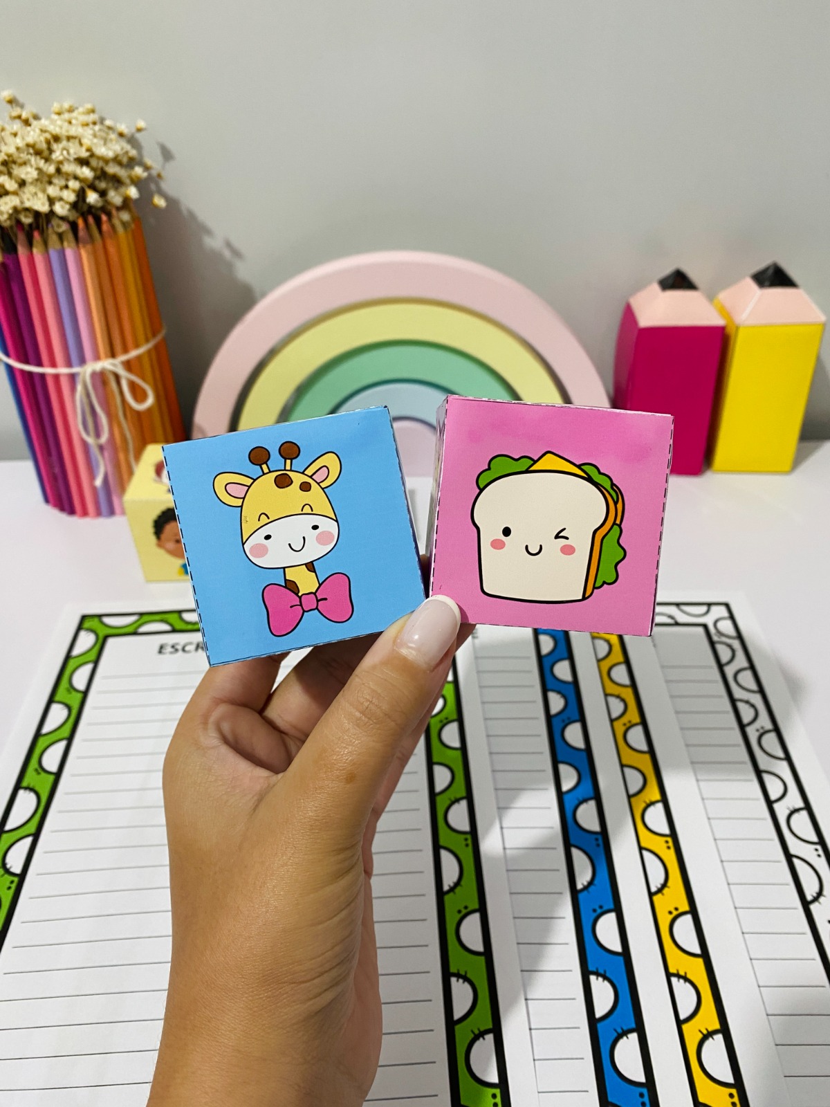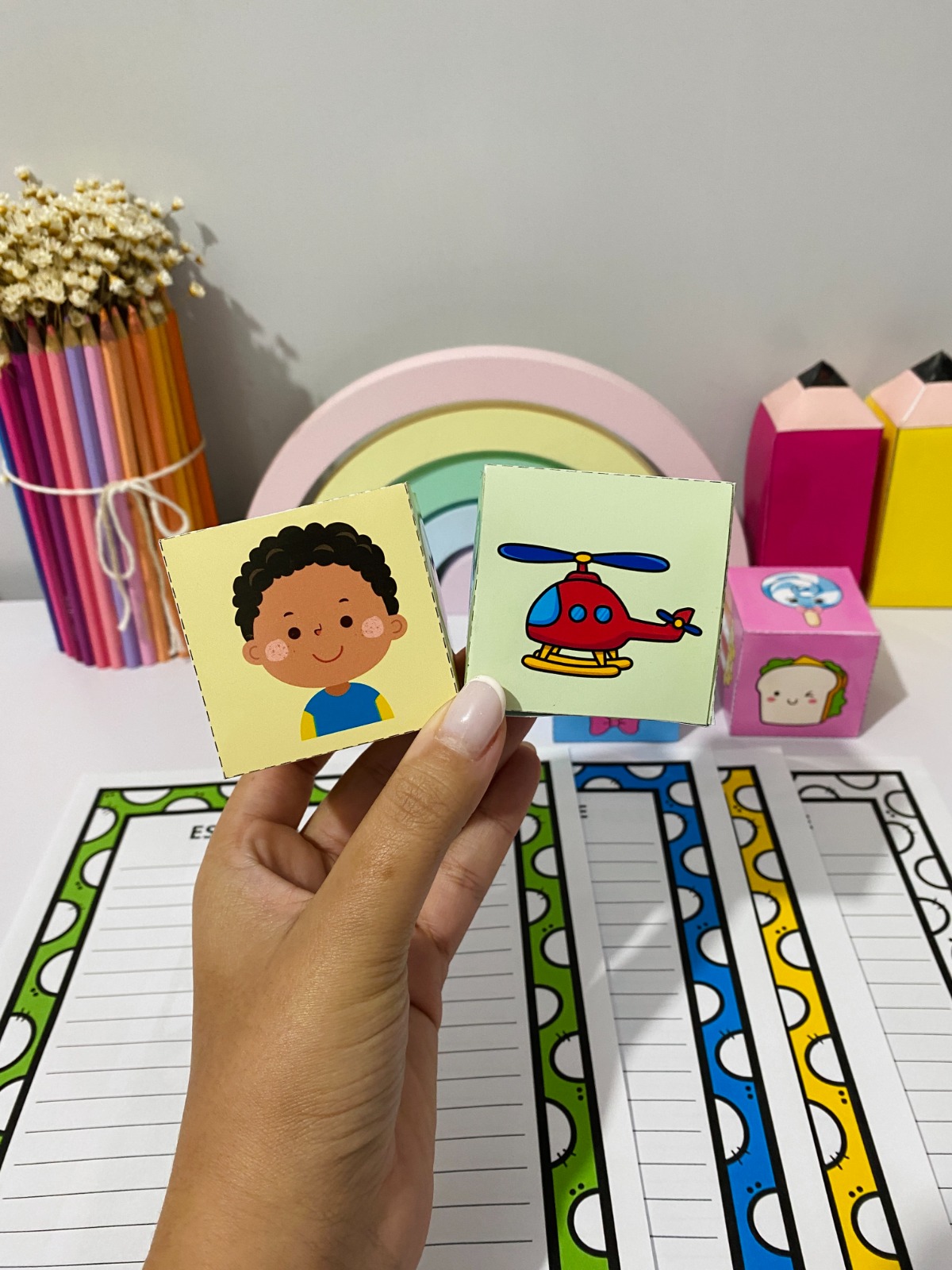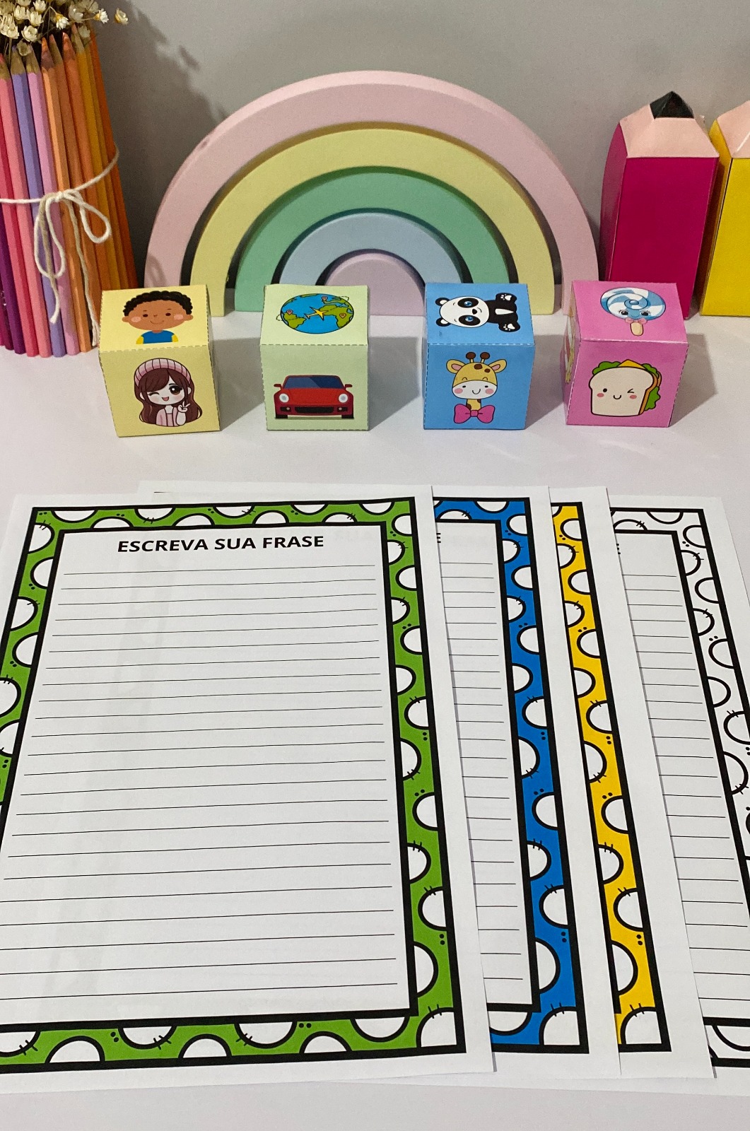 Esse material incrível acompanha 4 dados ilustrados com personagens e figuras que ajudam as crianças a criarem frases com mais facilidade e criatividade!