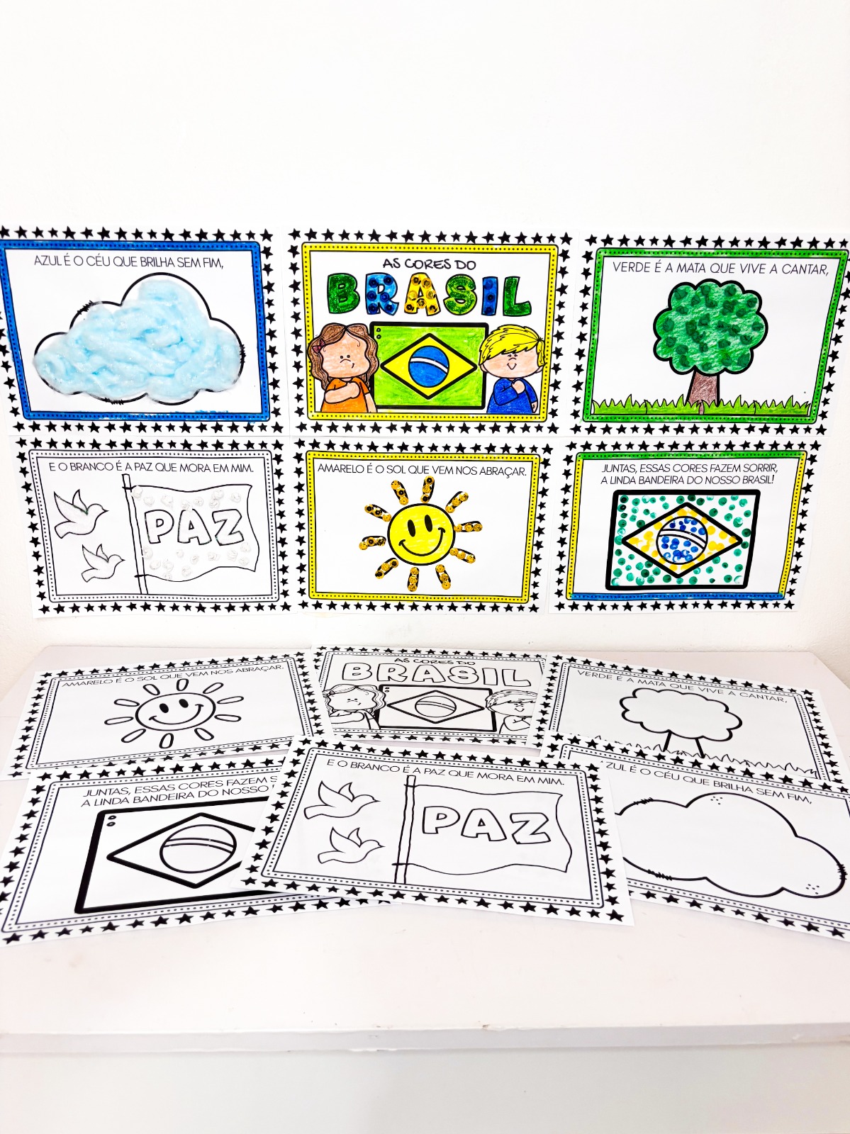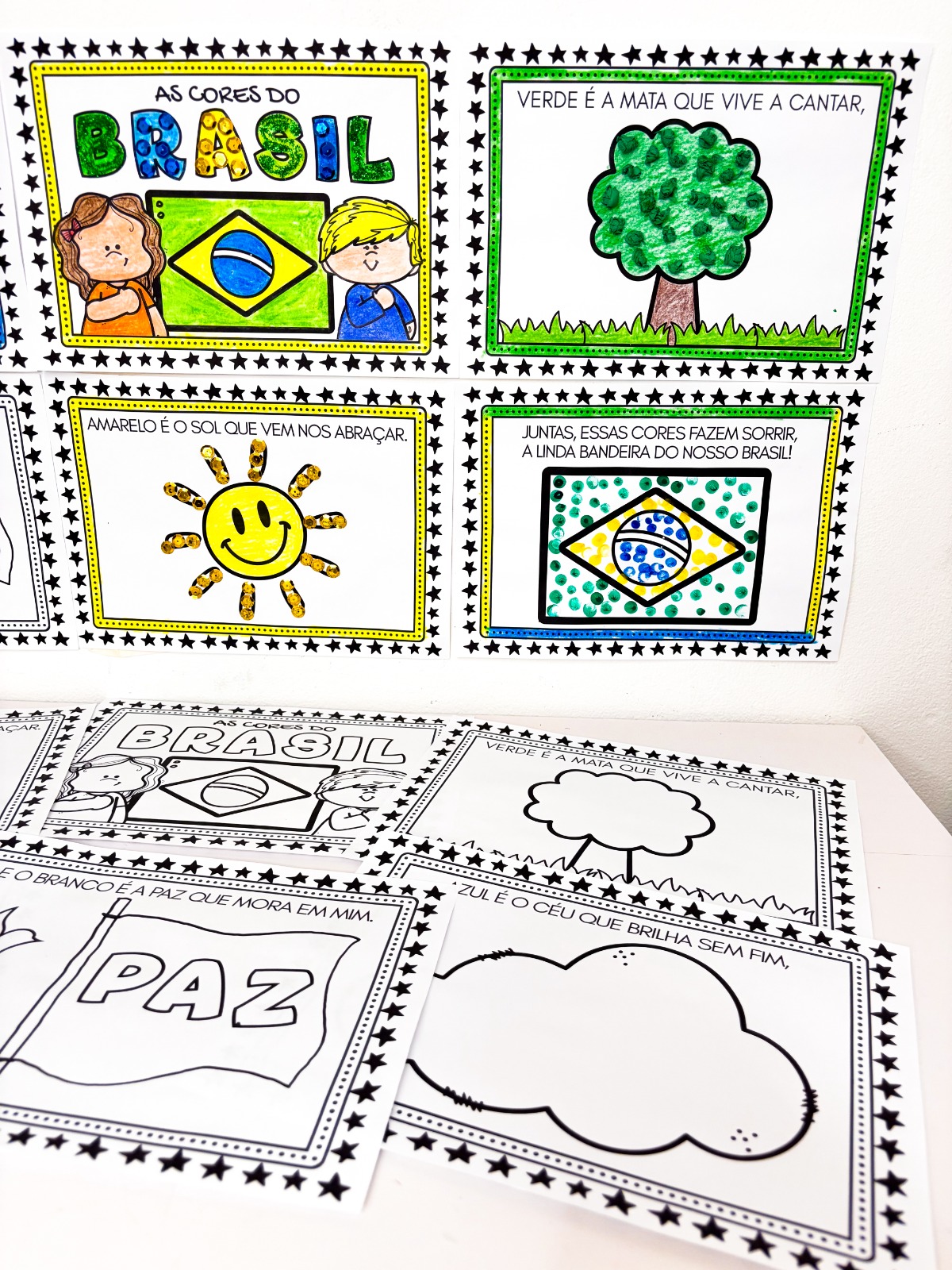Pensado especialmente para turmas da Educação Infantil, o livrinho traz atividades manuais que exploram recorte, colagem, coordenação motora e criatividade, enquanto as crianças aprendem de forma leve e prazerosa sobre as cores e símbolos do nosso país. 🌟