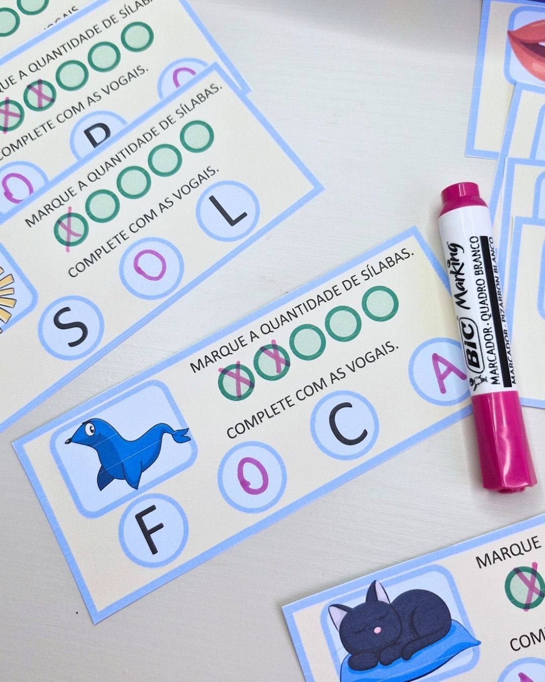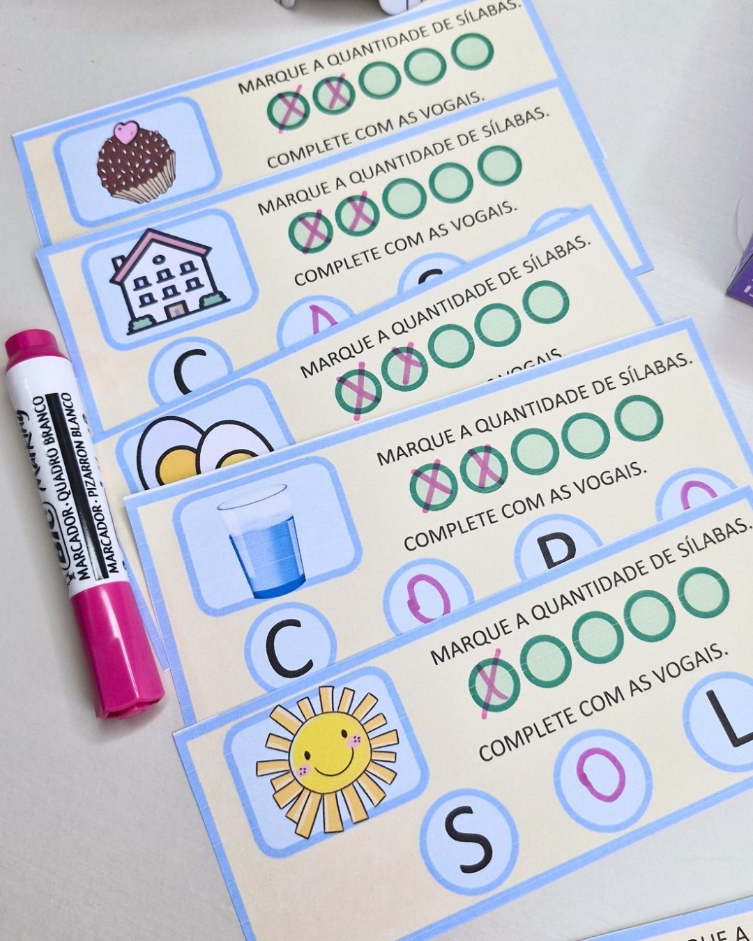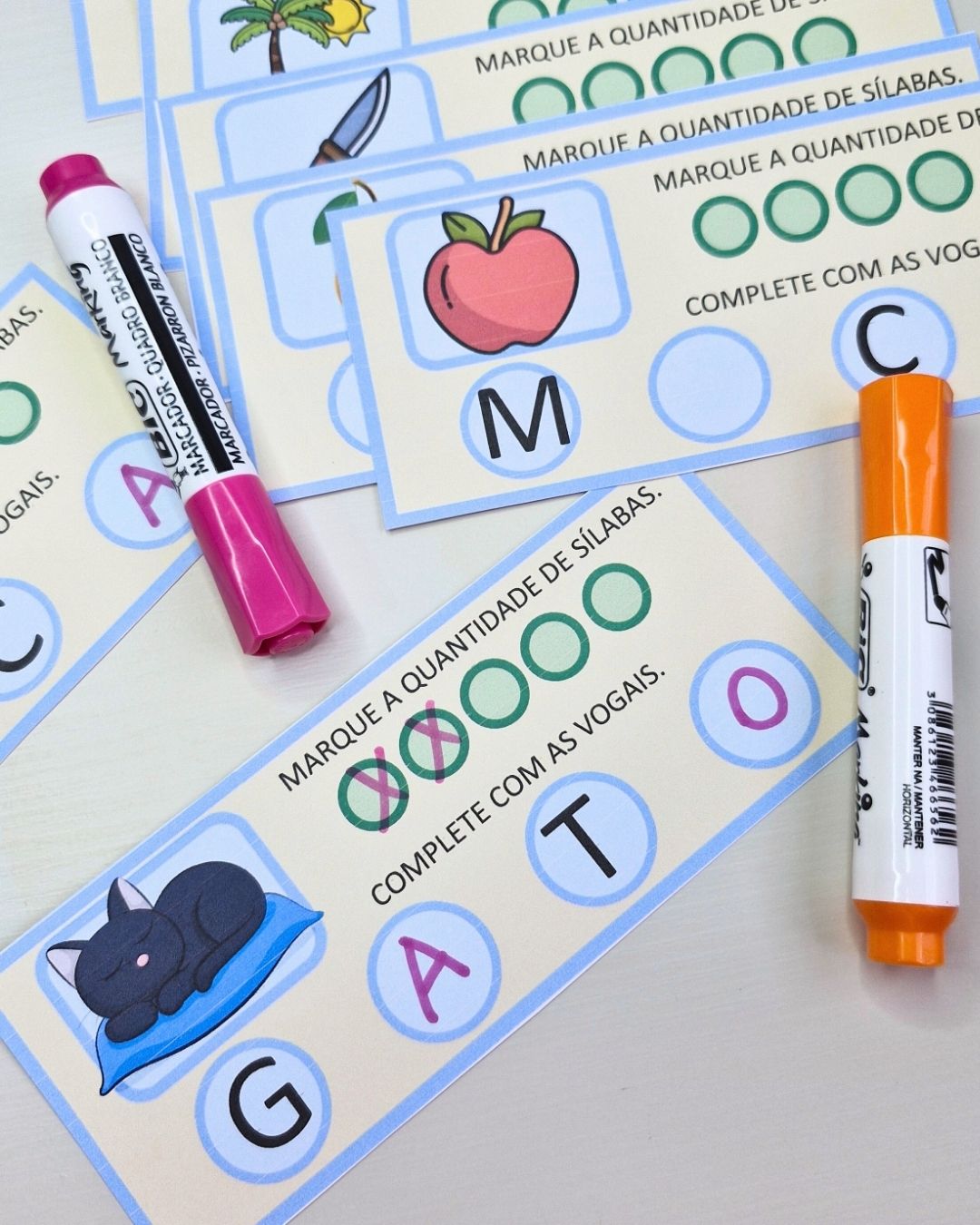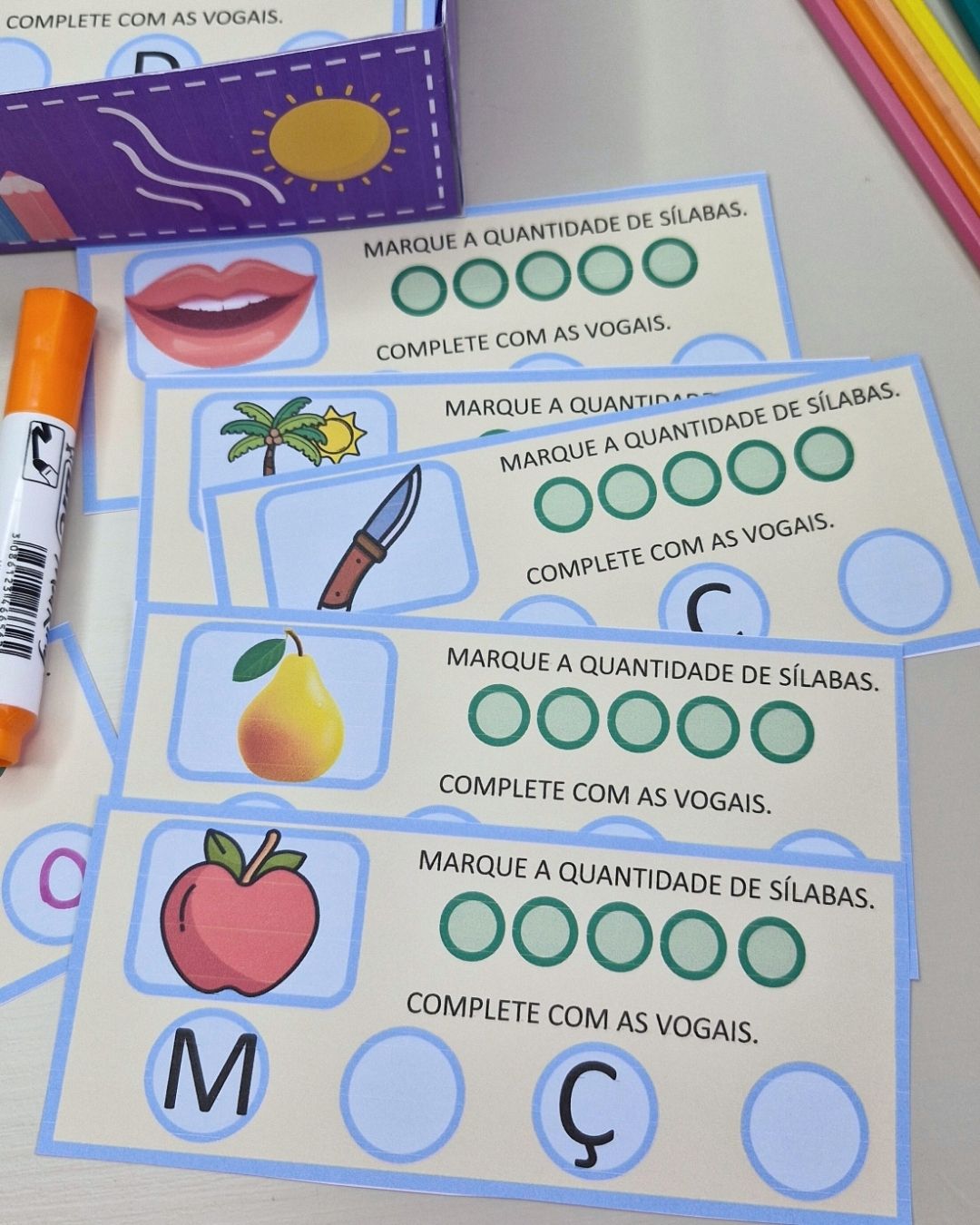 As crianças vão marcar as sílabas e completar as palavras com as vogais, fortalecendo a consciência fonológica e o reconhecimento das letras.
