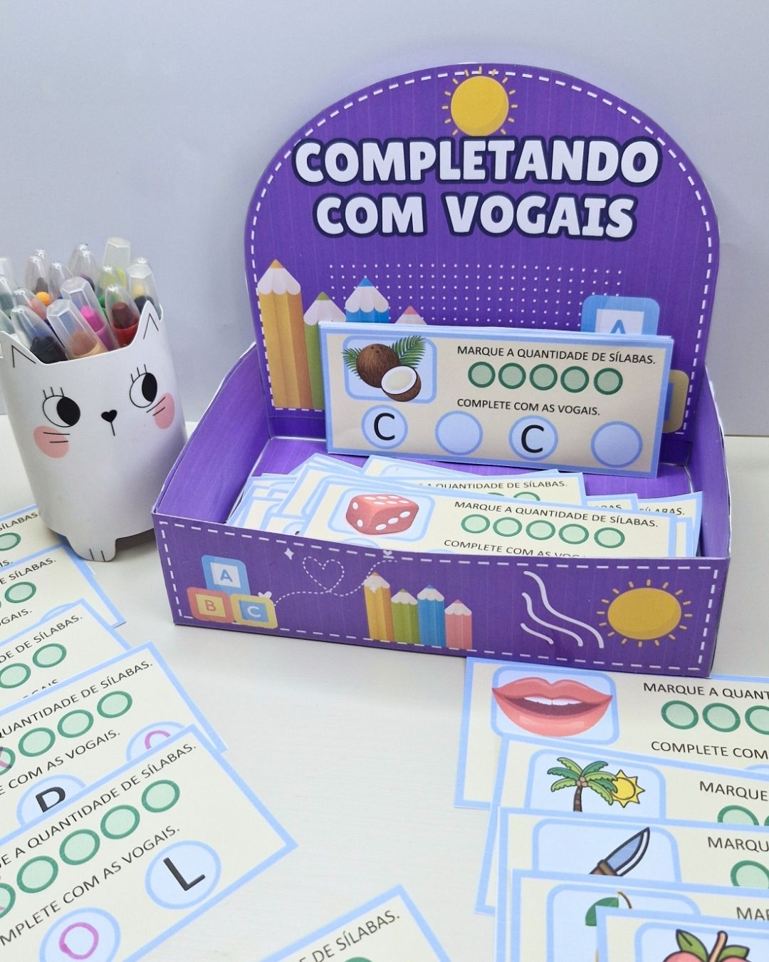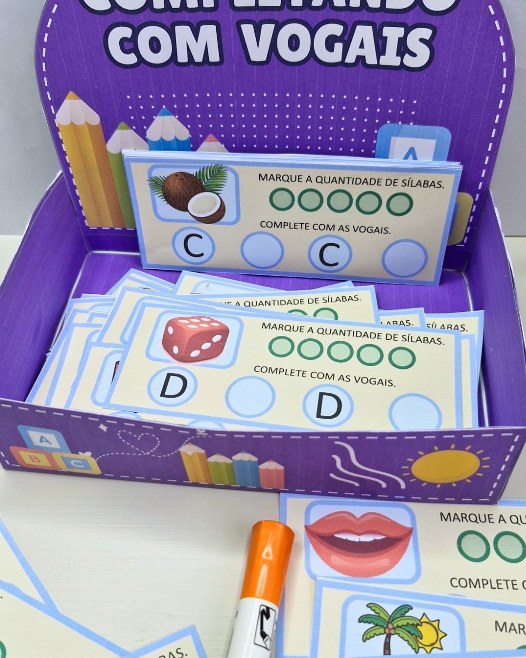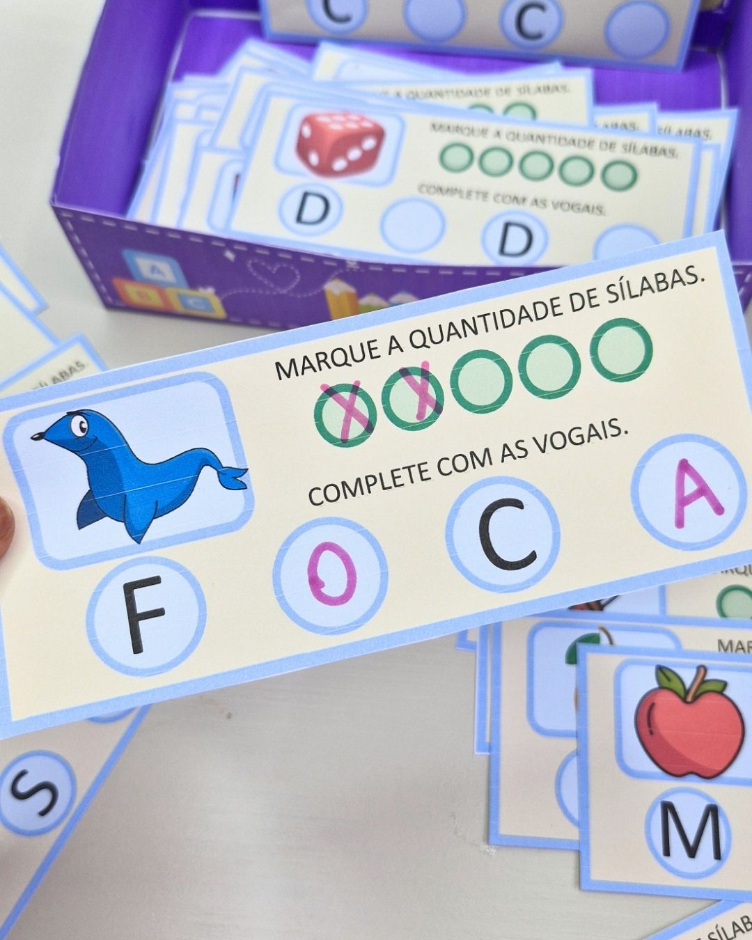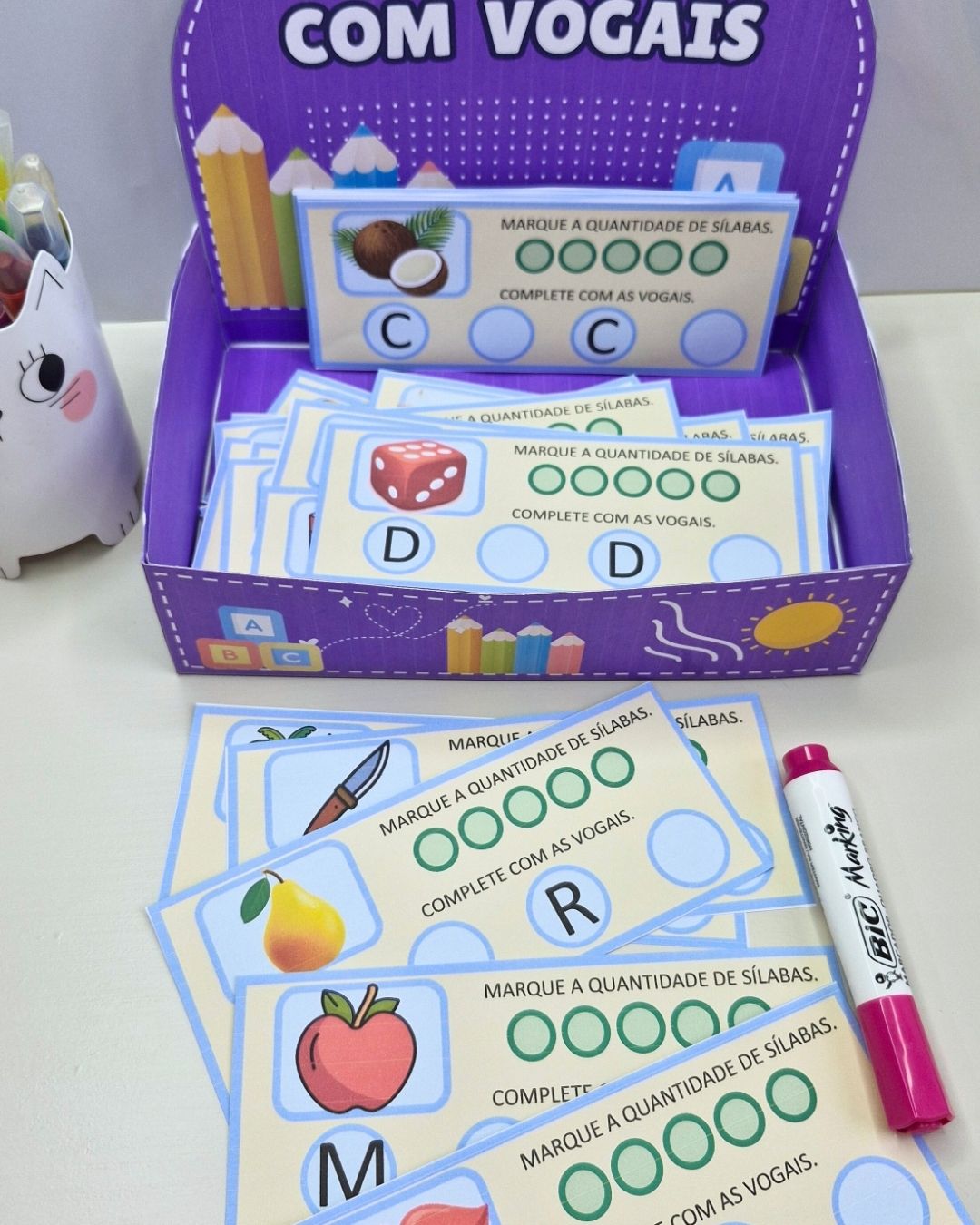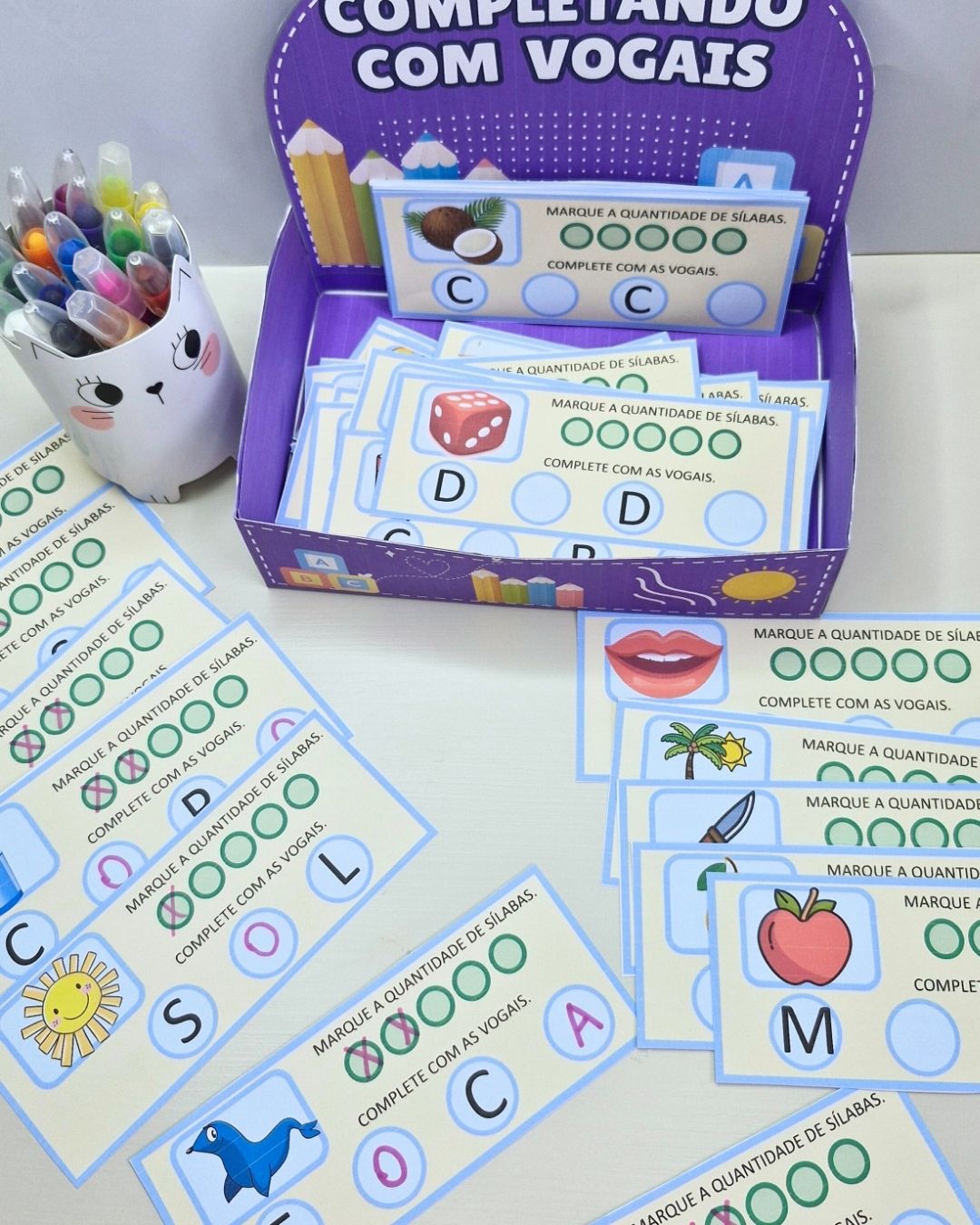As crianças vão marcar as sílabas e completar as palavras com as vogais, fortalecendo a consciência fonológica e o reconhecimento das letras.