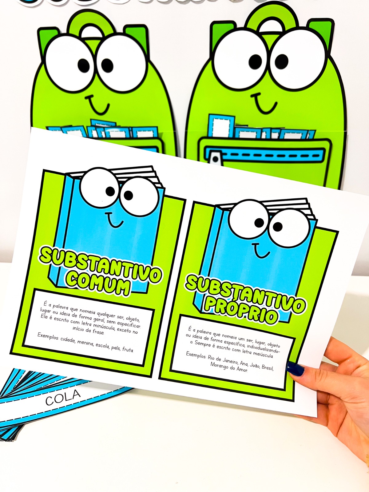 Fichas explicativas (coloridas ou para colorir) com linguagem simples e acessível, explicando a diferença entre substantivos comuns e próprios.