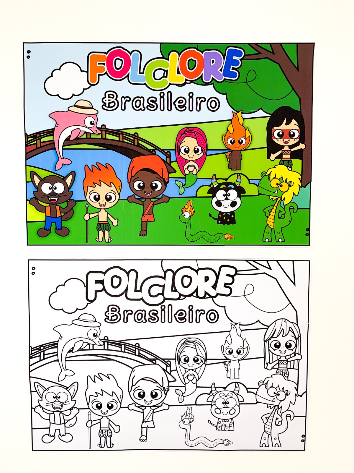 Esse painel ampliado, em 9 folhas A4, foi pensado pra ocupar espaço com significado — seja no mural, no cantinho da leitura ou onde a magia do folclore quiser morar.