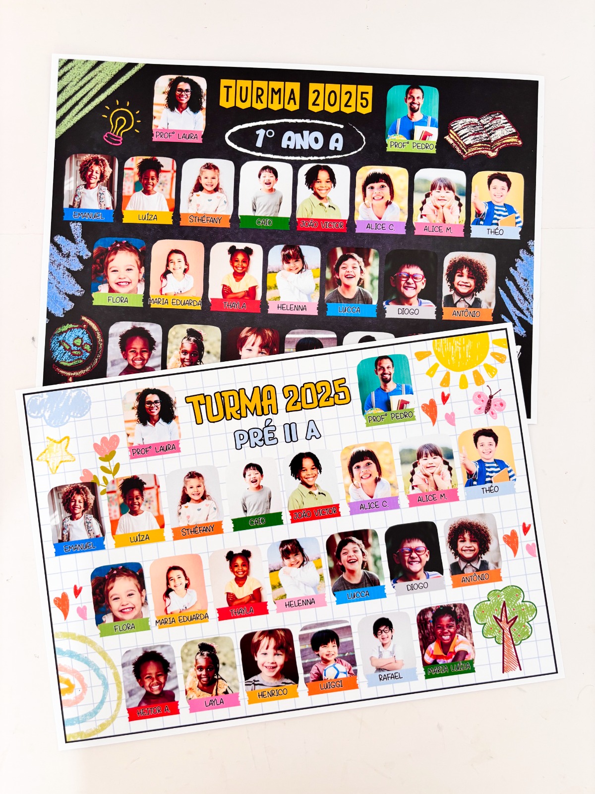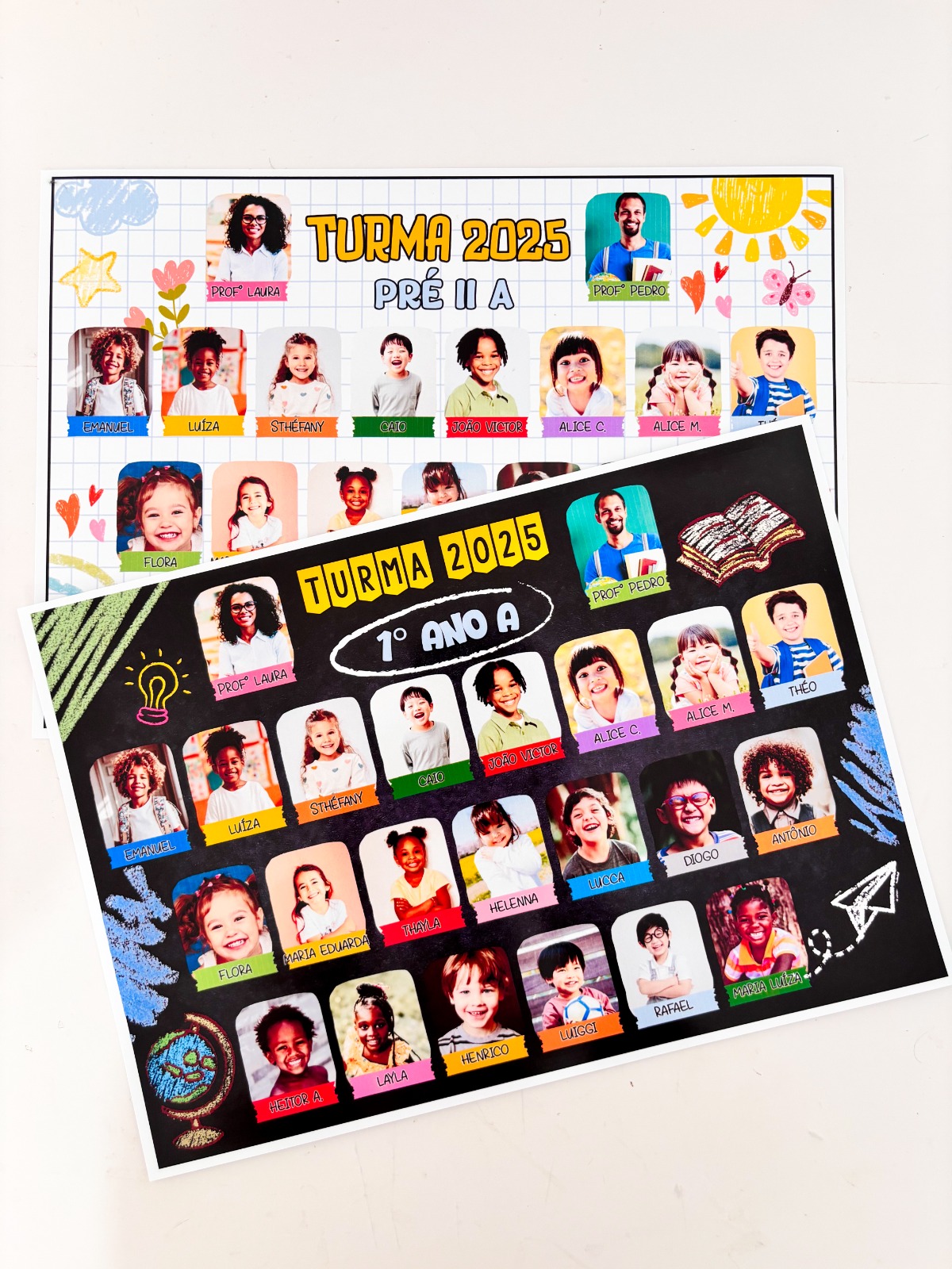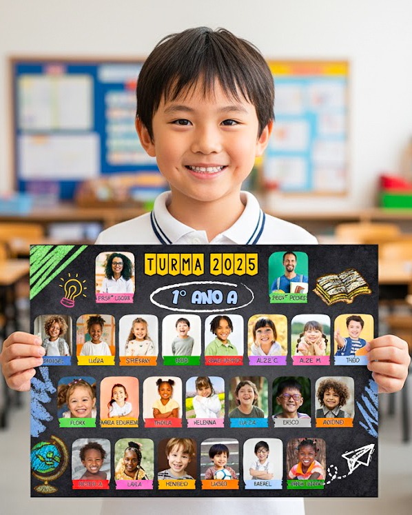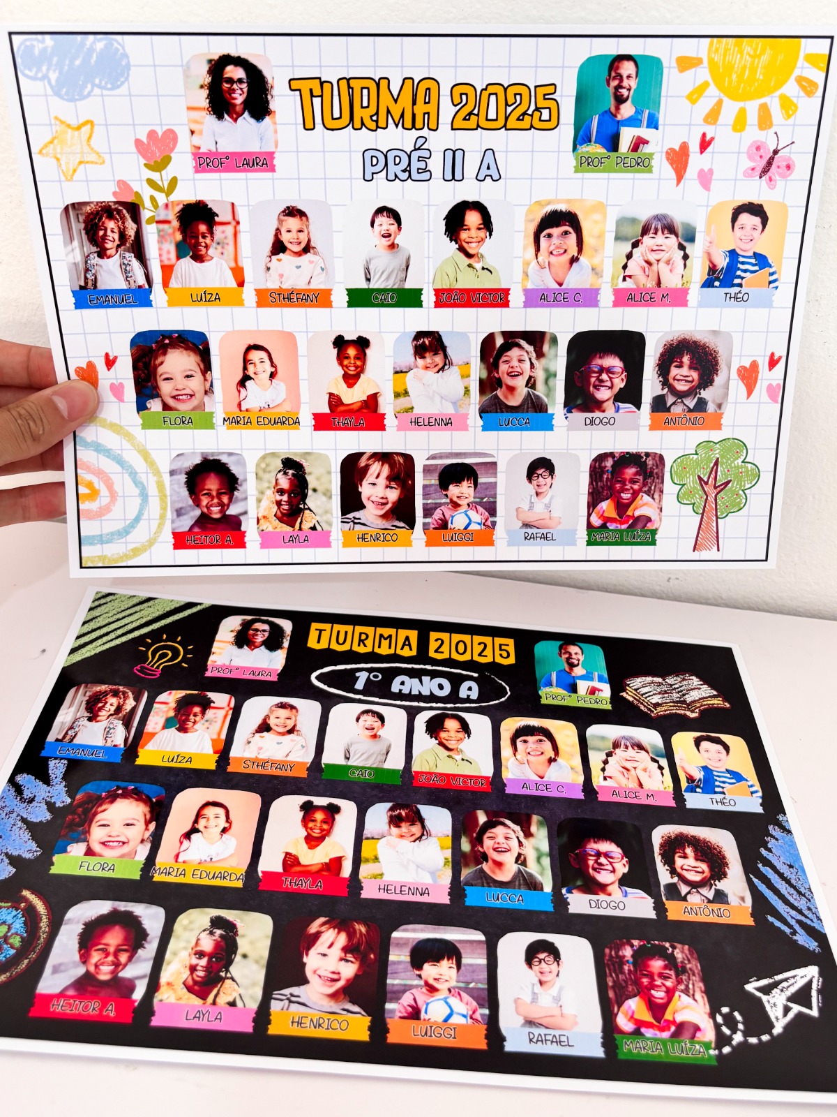 Você pode editar tudo: fotos, nomes, títulos e textos — deixando o quadro com a cara da sua turma e a essência desse ano tão especial.